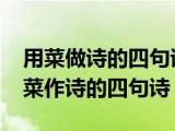 哈嘍,小天來為大家解答以下的問題,關(guān)于用菜做詩的四句詩是什么?以及思維過程,用菜作詩的四句詩這個(gè)很多人還不知道,那么現(xiàn)在讓我?guī)е蠹? 瀏覽全文>>