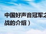 大家好,小夏來(lái)為大家解答以上的問(wèn)題。中國(guó)好聲音冠軍之戰(zhàn),關(guān)于中國(guó)好聲音冠軍之戰(zhàn)的介紹很多人還不知道,現(xiàn)在讓我們一起來(lái)看看吧!1、《 瀏覽全文>>