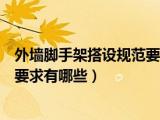 大家好,小樂(lè)來(lái)為大家解答以下的問(wèn)題,外墻腳手架搭設(shè)規(guī)范要求有哪些內(nèi)容,外墻腳手架搭設(shè)規(guī)范要求有哪些很多人還不知道,現(xiàn)在讓我們一起來(lái) 瀏覽全文>>