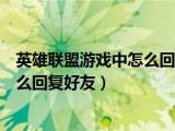 大家好,小樂來為大家解答以下的問題,英雄聯(lián)盟游戲中怎么回復(fù)好友發(fā)的信息,英雄聯(lián)盟游戲中怎么回復(fù)好友很多人還不知道,現(xiàn)在讓我們一起來 瀏覽全文>>